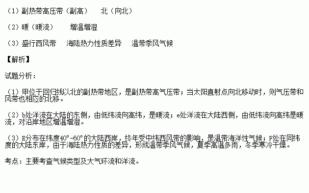 £¨3£©¡°ÆøºòÀàÐÍ·Ö²¼Ä£Ê½Í¼¡±ÖеÄE´¦È«Äêµ¥Ò»ÊÜ £¨ÆøÑ¹´ø»ò·ç´ø£©Ó°Ï죬ÔÚ´ó½Î÷°¶ÐγÉÁËÖÕÄêκͶàÓêµÄδøº£ÑóÐÔÆøºò£¬¶øÔÚ½üËÆÎ³¶ÈµÄ´ó½¶«°¶£¨F´¦£©£¬ÓÉÓÚ £¬ÐγÉÁËÏマßζàÓ꣬¶¬¼¾º®Àä¸ÉÔïµÄ £¨ÆøºòÃû³Æ£©¡£