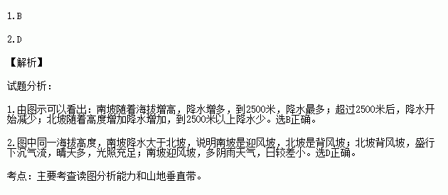 1.该山地年降水量随海拔高度升高而减少的高度出现在( )