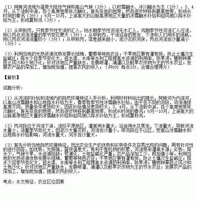 (1)阿姆河流域径流的年内分配特征是多峰式的,汛期延续很长,从3月到10月。结合材料,从气候、河流补给类型和地势,分析阿姆河汛期长的原因(9分)。