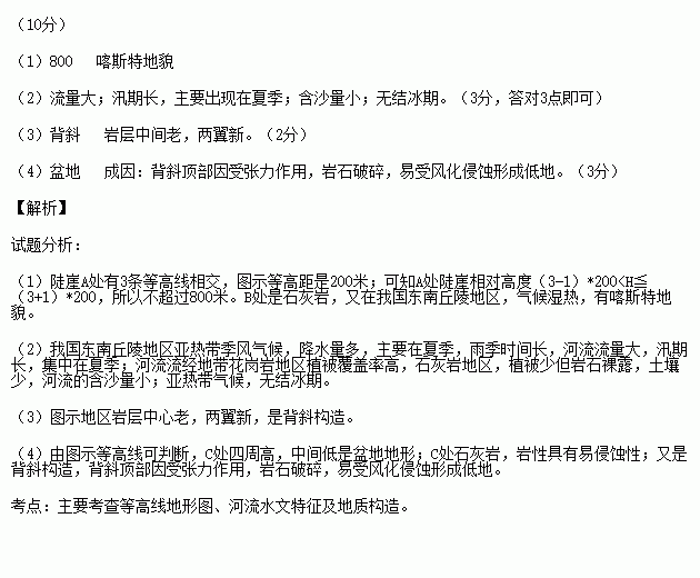 (1)图中陡崖A的相对高度不超过 米。B处是一著名旅游地,据图判断,该地吸引游人的地貌景观可能是 。(2分)