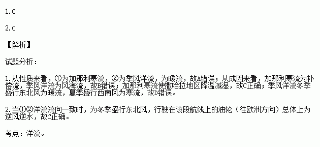 2.当①②洋流流向一致时,行驶在该段航线上的油轮(往欧洲方向)总体上