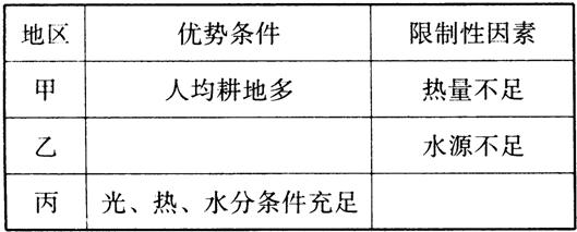 ½â´ð ½â£º£¨1£©Í¼Ê¾¼×λÓÚÎÒ¹ú¶«±±µØÇø£¬Å©ÒµÉú²úµÄÖ÷ÒªÓÅÊÆÊÇÍÁµØ×ÊÔ´Ãæ»ý¹ãÀ«£¬È˾ù¸ûµØÃæ»ý¶à£»ÇÒÍÁÈÀ·ÊÎÖ£»¶øÓÉÓÚγ¶È¸ß£¬¹ÊÈÈÁ¿²»×ãÊÇÖ÷ÒªµÄÏÞÖÆÌõ¼þ£®ÒÒλÓÚÎÒ¹úÎ÷±±µØÇø£¬Îª¸ÉºµµØÇø£¬¹ÊÏÞÖÆÅ©ÒµÉú²úµÄÌõ¼þΪˮԴ²»×㣻±ûλÓÚÎÒ¹ú³¤½Á÷Óò£¬ÎªÑÇÈÈ´ø¼¾·çÆøºòÓ°Ï죬¹Ê¹âÈȳä×㣬ÏÞÖÆÐÔÒòËØÎªºµÀÔÔÖº¦Æµ·±£®