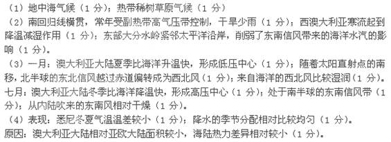 (3)结合澳大利亚北部的气候特征,从海陆热力性质的差异和气压带风带的季节移动两方面分析完成下表。