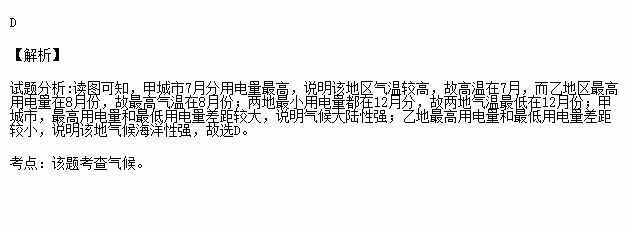 读“我国两城市的甲乙两家庭(人口、住房、收入等条件相当)各月用电量比较图”,读图,家庭用电量与所在地气候状况存在一定的相关性。下列说法正确的是