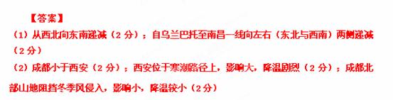 (2)比较西安与成都遭受寒潮影响程度的差异,并说明原因。(6分)