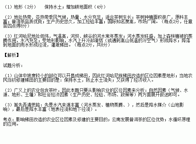 (1)简要说明红河哈尼梯田主要改造的农业区位因素以及当地农民当初修建梯田的主要目的。(6分)