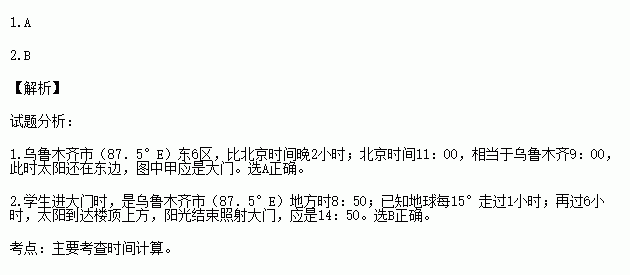 乌鲁木齐市(43.5°N,87.5°E)某中学生在5月的某天11:00(北京时间)走进学校教学楼大门时,发现影子落在自己的正前方。读图完成下题。