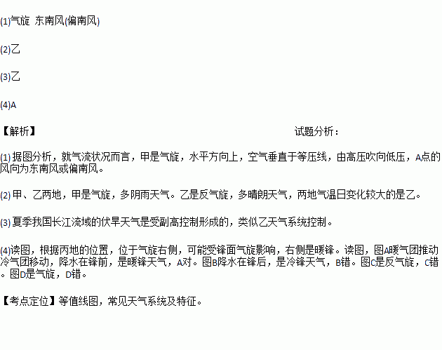 (3)夏季我国长江流域的伏旱天气是在类似____________ (甲或乙)天气系统控制下形成的。