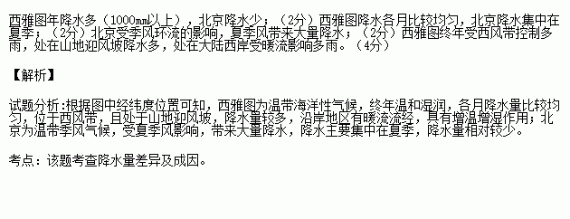 读 “美国中西部降水分布”图,比较北京与西雅图降水特点及原因。(10分)
