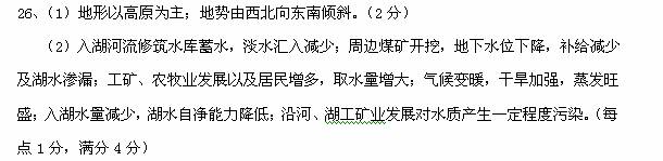 ⑵材料一中的红碱淖,是中国最大的沙漠淡水湖,但近年来湖面下降,水质变差,分析引起红碱淖湖水变化的可能原因 。(3分)