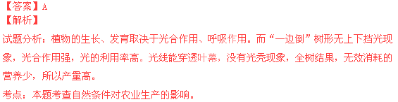 山东某地有果农研究出“一边倒”的桃树栽培技术——桃树倾斜一定角度,能够使桃树的亩产提高。完成下题。 “一边倒”桃树能够高产的主要原因是为更好的利用( )