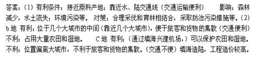(2)该地区计划建一大型机场,分别说明b、c两地作为机场选址的有利和不利条件。(9分)(提示:大型机场占地规模大,c地需填海。)