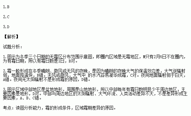 ˪ÊÇ´óÆøÖеÄË®ÆûÄý»ªÔÚµØÃæ»òµØÎïÉÏ£¨Èç²ÝÒ¶µÈ£©Ðγɵıù¾§£¬Ò»°ãÐγÉÔÚ¶¬¼¾ÇçÀÊ¡¢Î¢·ç»òÎÞ·çµÄÒ¹Íí£¬ÏÂÍ¼ÎªÄ³ÇøÓò2010Ä궬¼¾Èý¸öÈÕÆÚµÄÎÞËªÇø·Ö²¼·¶Î§Ê¾Òâͼ£¬Í¼ÖÐÎÞËªÇøÍâ¾ùΪÓÐËªÇø£¬¶Áͼ»Ø´ðÏÂÁи÷Ìâ