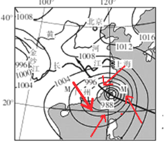【3】结合上题分析已知M天气系统为低压系统,水平方向气流由四周向中心呈逆时针辐合;由图可知广州市位M天气系统的西侧,应该盛行西北风(如下图所示),所以国旗将飘向东南方,故选项A正确。