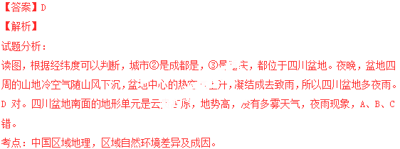 36.“晚见江山雾,宵闻夜雨来”是图中哪两个城市的写照 ( )