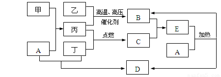 (6分)下列框图所示的物质转化关系中,甲是日常生活中常见的金属,乙、丙、丁是常见的气体单质。气体B与气体C相遇产生大量的白烟,D是海水中浓度最高的盐(部分反应物和生成物及溶剂水已略去)。