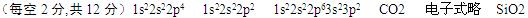 (12分)化合物YX2、ZX2中,X、Y、Z都是短周期元素,X与Y为同周期元素,Y与Z为同族元素,Y原子的最外层p能级电子数等于前一电子层电子总数。X原子最外层p能级中只有一个轨道填充了2个电子,则X的电子排布式为 ;Y的电子排布式为 ;Z的电子排布式为 ;YX2的化学式是 ,电子式是 ;ZX2的化学式是
