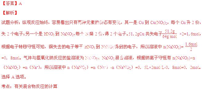 将51.2 g Cu完全溶于适量浓硝酸中,收集到氮氧化物(含NO、NO2)的混合物共0.8 mol,这些气体恰好能被500 mL 2 mol/L NaOH溶液完全吸收,发生的反应为:2NO2+2NaOH=NaNO2+NaNO3+H2O、NO+NO2+2NaOH=2NaNO2
