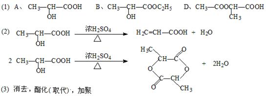 (2)A能和乙醇或乙酸发生酯化反应,所以生成物B和D的结构简式分别是CH3CHOHCOOC2H5、CH3COOCH(CH3)COOH。