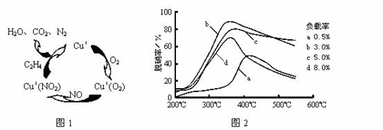 ⑶目前,科学家正在研究一种以乙烯作为还原剂的脱硝(NO)原理,其脱硝机理示意图如下图1,脱硝率与温度、负载率(分子筛中催化剂的质量分数)的关系如图2所示。