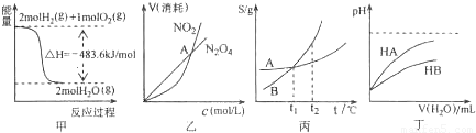 | A¡¢±û±íʾA¡¢BÁ½ÎïÖʵÄÈܽâ¶ÈËæÎ¶ȱ仯Çé¿ö£¬½«t1¡æÊ±A¡¢BµÄ±¥ºÍÈÜÒº·Ö±ðÉýÎÂÖÁt2¡æÊ±£¬ÈÜÖʵÄÖÊÁ¿·ÖÊýB£¾A | B¡¢¶¡±íʾ³£ÎÂÏ£¬Ï¡ÊÍHA¡¢HBÁ½ÖÖËáµÄÏ¡ÈÜҺʱ£¬ÈÜÒºpHËæ¼ÓË®Á¿µÄ±ä»¯£¬ÔòNaAÈÜÒºµÄpHСÓÚͬŨ¶ÈµÄNaBÈÜÒºµÄpH | C¡¢¼×±íʾH2ÓëO2·¢Éú·´Ó¦¹ý³ÌÖеÄÄÜÁ¿±ä»¯£¬ÔòH2µÄ±ê׼ȼÉÕÈÈΪ¡÷H=-241.8kJ?mol-1 | D¡¢ÒÒ±íʾºãκãÈÝÌõ¼þÏ·¢ÉúµÄ¿ÉÄæ·´Ó¦2NO2?N2O4£¨g£©ÖУ¬¸÷ÎïÖʵÄŨ¶ÈÓëÆäÏûºÄËÙÂÊÖ®¼äµÄ¹ØÏµ£¬ÆäÖн»µãA¶ÔÓ¦µÄ״̬Ϊ»¯Ñ§Æ½ºâ״̬ |