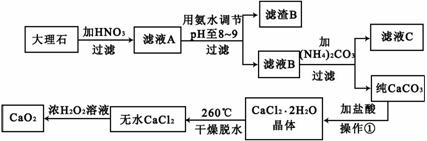 过氧化钙(CaO2)难溶于水,在常温下稳定,在潮湿空气及水中缓慢分解放出氧气,因而广泛应用于渔业、农业、环保等许多方面。下图是以大理石(主要杂质是氧化铁)等为原料制取过氧化钙(CaO2)的流程。