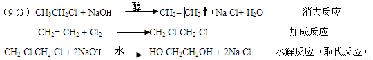 (9分)由CH3CH2Cl经过3步制乙二醇(HO CH2CH2OH,写出化学方程式,注明反应条件及反应类型: