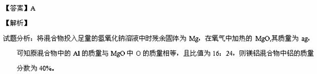 将镁和铝的混合物a g投入到足量的氢氧化钠溶液中,充分反应后将残余固体洗净,然后使残余固体在足量的纯氧中加热,最终得到a g固体,则镁铝混合物中铝的质量分数为( )