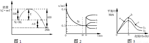 | A、该反应为自发反应,由图1可得加入适当的催化剂,E和△H都减小 | B、图2中0~10min内该反应的平均速率v(H2)=0.045mol?L-1?min-1,从11min起其它条件不变,压缩容器的体积为1L,则n(N2)的变化曲线为d | C、图3中a、b、c三点所处的平衡状态中,反应物N2的转化率最高的是b点 | D、图3中T1和T2表示温度,对应温度下的平衡常数为K1、K2,则:T1>T2,K1>K2 |