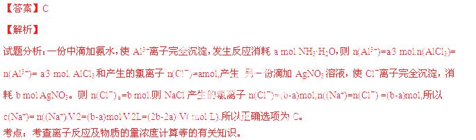 有AlCl3和NaCl的混合溶液VL,将它均分成两份。一份滴加氨水,使Al3+离子完全沉淀;另一份滴加AgNO3溶液,使Cl-离子完全沉淀。反应中消耗a mol NH3·H2O、b mol AgNO3。据此得知原混合溶液中的c(Na+) (mol/L)为