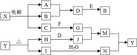 (14分)下列框图中的字母分别代表一种常见的物质或其溶液,相互之间的转化关系如下图所示(部分产物及反应条件已略去)。已知A、B为气态单质,F是地壳中含量最多的金属元素的单质;E、H、I为氧化物,E为黑色固体,I为红棕色气体;M为红褐色沉淀。![]()