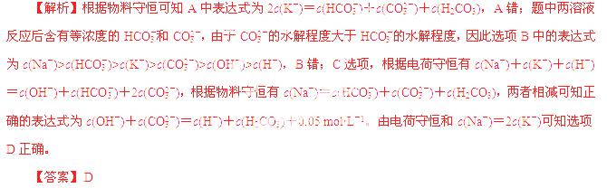 将0.2 mol·L-1 NaHCO3溶液与0.1 mol·L-1 KOH溶液等体积混合,下列关系正确的是 ( )