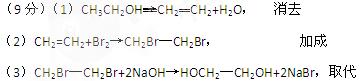 (9分)用乙醇制取乙二醇(HOCH2—CH2OH),需要经过3个阶段,依次写出反应的化学方程式,并注明反应类型: