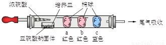 (1)进行微量实验:如图所示,将浓硫酸滴入装有Na2SO3固体的培养皿一段时间后,a、b、c三个棉球变化如下表。