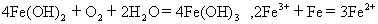 | 《普通化学教程》(下册)P788 | 白色 | 能强烈吸收O2,迅速变成棕色 Fe(OH)3.这时作为氧化的中间产物为土绿色,其中含有Fe2+、Fe3+. |