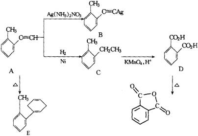 (5分)某不饱和烃A,分子式为C9H8,它能和银氨溶液反应产生白色沉淀B。A催化加氢得到化合物C(C9H12),将化合物B用酸性高锰酸钾氧化得到化合物D(C8H6O4),将化合物加热则得到另一个不饱和化合物E。试写出A,B,C,D,E的结构。