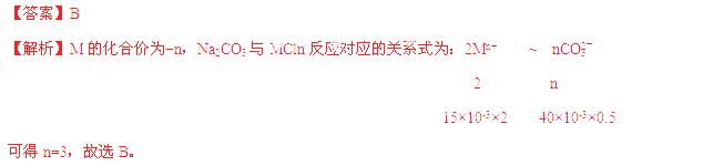 将15ml.2mol/LNa2CO3溶液逐滴加入到40 ml.0.5mol/LMCln盐溶液中,恰好将溶液中的Mn+离子完全沉淀为碳酸盐,则MCln中n值是 ( )