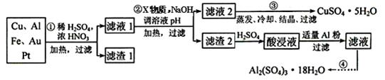 电子产品产生的大量电子垃圾对环境构成了极大的威胁。某化学兴趣小组将一批废弃的线路板简单处理后,得到含Cu、Al、Fe及少量Au、Pt等金属的混合物,并设计出如下制备硫酸铜和硫酸铝晶体的路线: