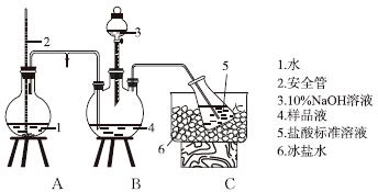 ①氨的测定:精确称取w g X,加适量水溶解,注入如图所示的三颈瓶中,然后逐滴加入足量10%NaOH溶液,通入水蒸气,将样品液中的氨全部蒸出,用V1 mL cl mol·L-1的盐酸标准溶液吸收。蒸氨结束后取下接收瓶,用c2 mol·L-1NaOH标准溶液滴定过剩的HCl,到终点时消耗V2 mL NaOH溶液。