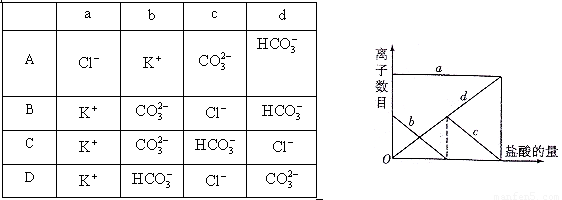 向一定量的K2CO3溶液中缓慢滴加稀盐酸,并不断搅拌。随着盐酸的加入,溶液中离子数目也相应地发生变化。如图所示,四条曲线与溶液中的离子的对应关系,完全正确的是 ( )