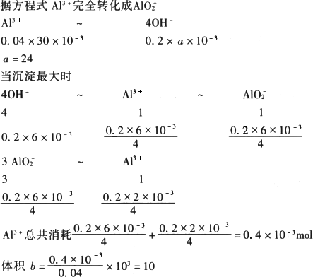 在30 mL 0.04 mol/L的A1Cl3溶液中逐滴加入0.2 mol/L的NaOH溶液,开始时有沉淀生成,当加到a mL时沉淀刚好溶解,如果在6 mL 0.2 mol/L NaOH溶液中逐滴加入0.04 mol/L的AlCl3溶液,当加到b mL时生成沉淀的质量最大,则a、b的数值分别为 | |