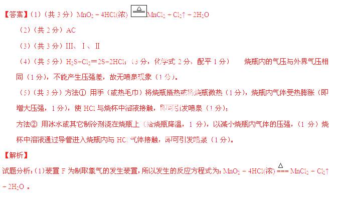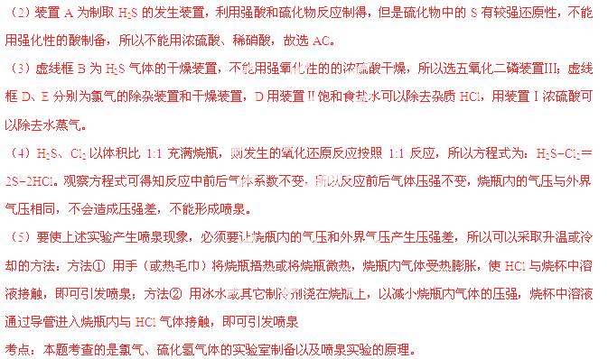(4)打开K1、K2,将常温压下的H2S、Cl2以体积比1:1充满烧瓶后,烧瓶中发生的反应用化学方程式表示为 ;关闭K1、K2,始终看不到烧瓶内产生“喷泉”现象,理由是: 。