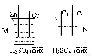 试题分析:由于金属性:Zn>Cu>C,则图中M装置为原电池,Zn是负极,Cu是正极,N装置为电解池,与正极相连的C1是阳极,阳极上一定发生氧化反应,故A项错误;原电池的内电路中,阴离子一定移向负极,阳离子一定移向正极,因为负极流出带负电的电子,正极流入带负电的电子,由于硫酸根离子是阴离子,所以它移向Zn电极,故B项错误;负极反应式为Zn—2e—=Zn2+,正极反应式为2H++2e—=H2↑,则原电池总反应式为Zn+2H+=Zn2++H2↑,所以M装置中氢离子浓度减小,由于pH=—lgc(H+),则M装置中硫酸溶液的pH增大;由于石墨是惰性电极,则阴极反应式为2H++2e—=H2↑,由于氢氧根离子比硫酸根离子容易失去电子,则阳极反应式为4OH——4e—=2H2O+O2↑,则N装置中电解总反应式为2H2O