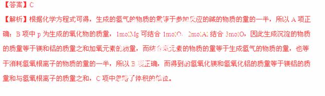 c mol/L氢氧化钾溶液V mL,使金属离子刚好沉淀完全,得到的沉淀质量为n g。再将得到的沉淀灼烧至质量不再改变为止,得到固体p g。则下列关系不正确的是 ( )