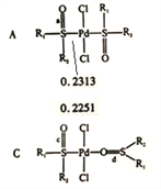 )生成配合物。①亚砜由分子构成,晶体类型为分子晶体。②配位键稳定性:Pd-s>Pd-O,其证据为Pd-S键长A中为0.2313nm;Pd-O键长B中为0.2007nm,B中为0.2033nm ,键长越短越稳定。③b中O电子提供给Pd,S=O键长最长,A、C对比,如图