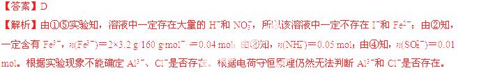 ①测定溶液pH,pH=2;②向溶液中滴加过量氢氧化钠溶液,过滤、洗涤、灼烧、称重,得固体质量为3.2 g;③向溶液中加入过量浓氢氧化钠溶液,加热,收集到气体1.12 L(标准状况);④向溶液中加入足量的氯化钡溶液,过滤、洗涤、干燥、称重,得固体2.33 g;⑤向溶液中加入适量浓硫酸,再加入铜粉,振荡溶液,产生红棕色气体。下列对实验结论的分析合理的是 ( )
