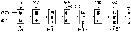 铬铁矿的主要成分可表示为FeO·Cr2O3,还含有MgO、Al2O3、Fe2O3等杂质,下图所示是以铬铁矿为原料制备重铬酸钾(K2Cr2O7)的工艺流程。