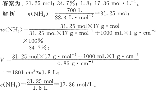 (3)在标准状况下,700 L NH3的物质的量为_________,全部溶解在1 L水中,所得溶液的质量分数为_________,如果该氨水的密度为0.85 g·cm-3,则氨水的体积为_________ L,物质的量浓度为_________。