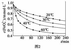 浓度为1.0 mmol·L-1的试样,将试样分别置于20 ℃、30 ℃、40 ℃和60 ℃的恒温水浴中,考察不同温度对K2FeO4某种性质的影响,结果见图2。则
