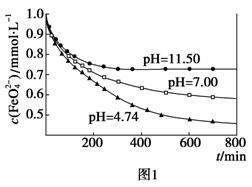 由图1可知,800 min时,pH=11.50的溶液中高铁酸钾最终浓度比pH=4.74的溶液中高,主要原因是 ▲ 。